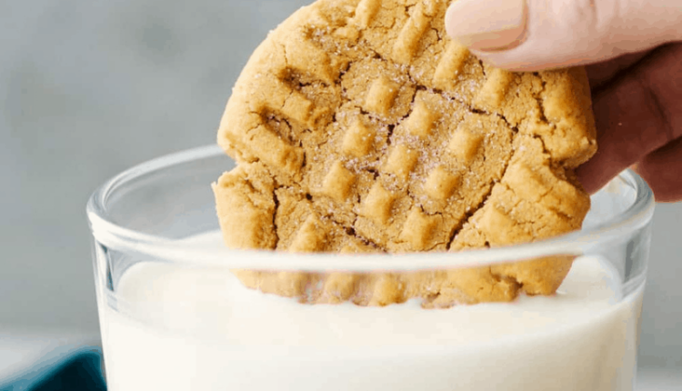 3 Ingredient peanut butter cookie dipped in a cold glass of milk.