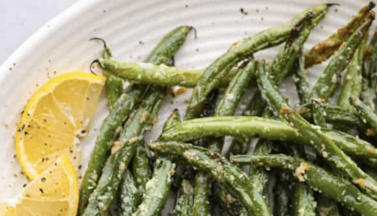 • In a bowl, add the green beans, olive oil, lemon juice, parmesan, garlic powder, salt, and pepper.