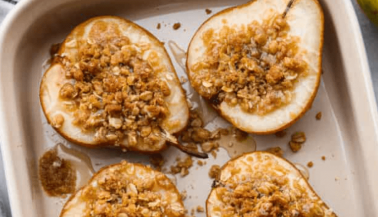 Topped with oats, brown sugar, and cinnamon, these baked pears make the perfect low-calorie cobbler-like treat! Serve them with a side of ice cream for a delicious dessert, or eat them in the morning with some yogurt for a perfectly sweet start to your day.