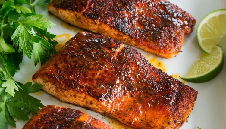 Salmon fillets are liberally seasoned with a homemade cajun style seasoning then pan seared in a hot skillet until lightly charred and blackened. Then last but not least it’s finished with a super flavorful and rich buttery honey lime sauce to compliment it.