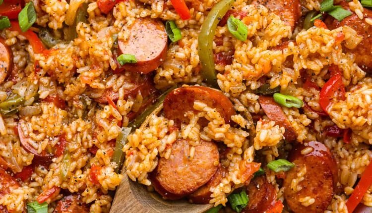 Remove the skillet from heat, keep it covered and let it rest for another 5 minutes. Remove the lid and fluff the rice to redistribute all the vegetables and sausage throughout.