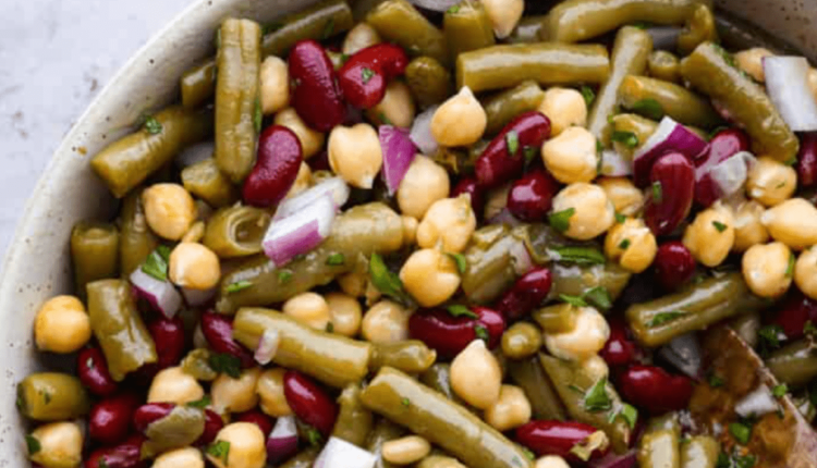 If you’re looking for a tasty, protein-packed salad to bring to all of your summer get-togethers, look no further! This quick and easy salad uses 3 different types of beans- green, kidney, and garbanzo, all tossed in a delicious, tangy dressing. I add in chopped red onions too for crunch and a pop of flavor! It’s going to fly off the table at your next potluck.