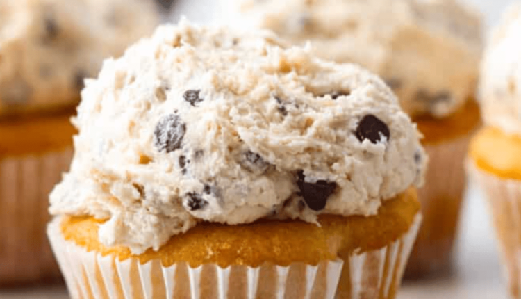 Adding a scoop of cookie dough frosting to a cupcake.