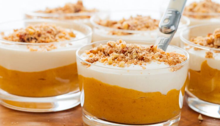 These pumpkin treats feature a mousse-like blend of pumpkin purée, Greek yogurt, and pumpkin spice. We top the pumpkin base with a creamy, tangy blend of cream cheese and Greek yogurt. Each layer is naturally sweetened with maple syrup.
