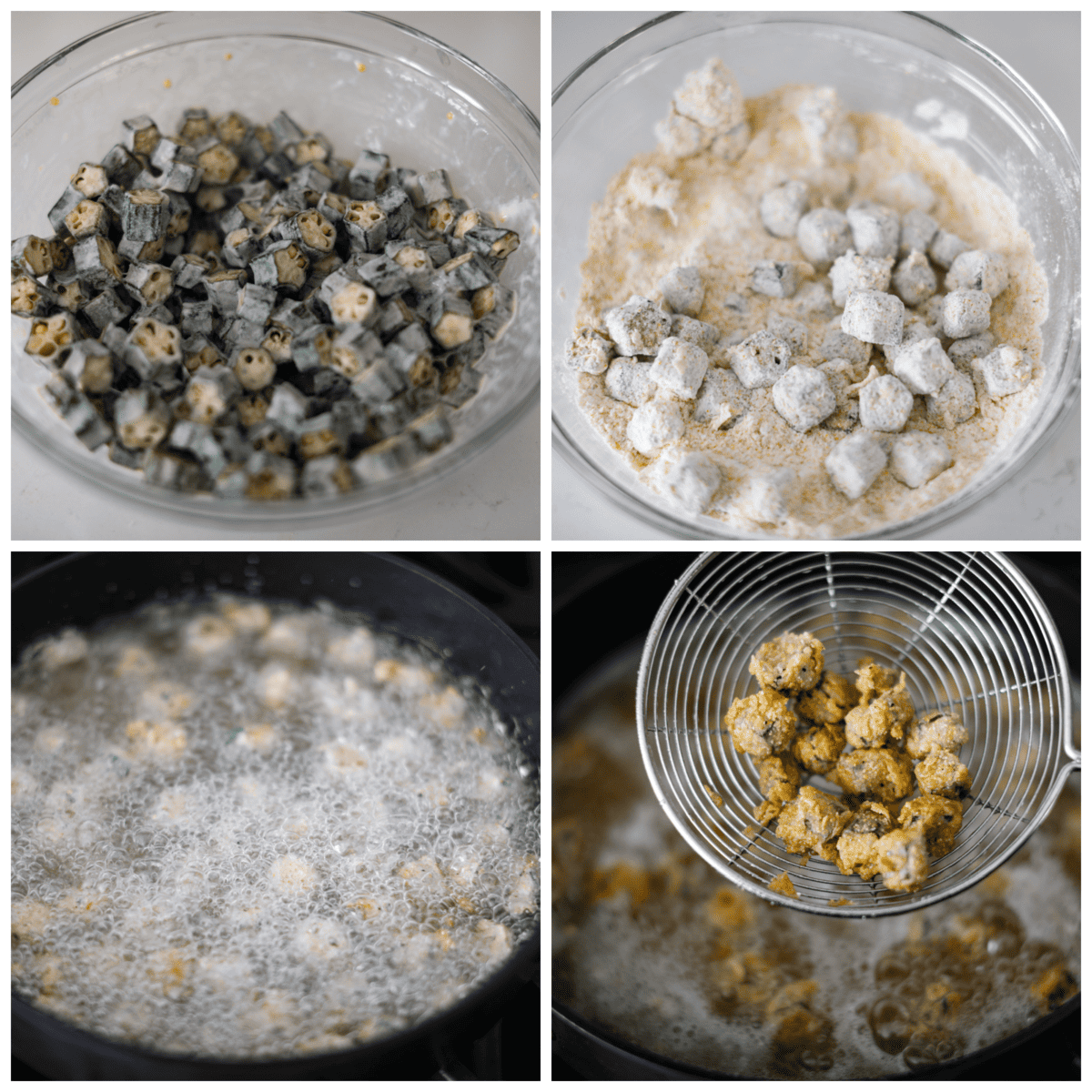 - Coat: Place the drained okra into the bowl of flour and then toss to coat.