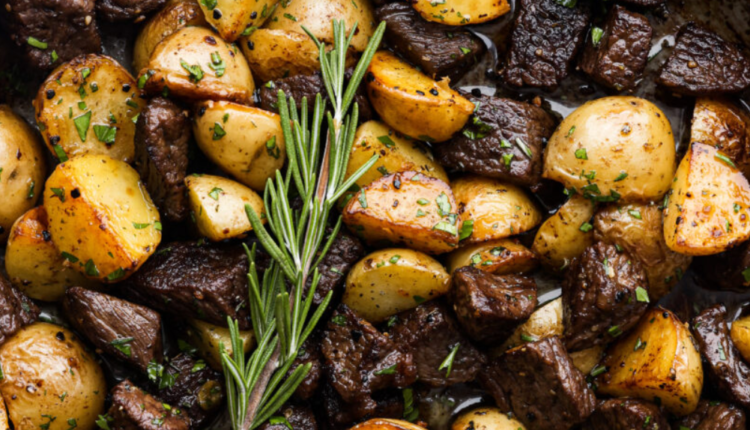 Close up of Garlic Butter Herb Steak Bites with Potatoes.
