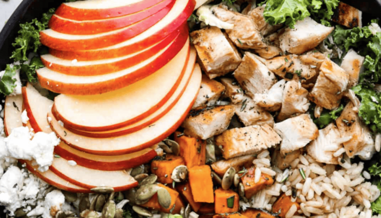 This Harvest Bowl recipe is a mix of tasty ingredients like juicy chicken, fresh greens, and flavorful apple and crunchy pecans! Let’s take a closer look at each ingredient and how they come together to make this wonderful dish. Note: exact measurements are in the recipe card below.
