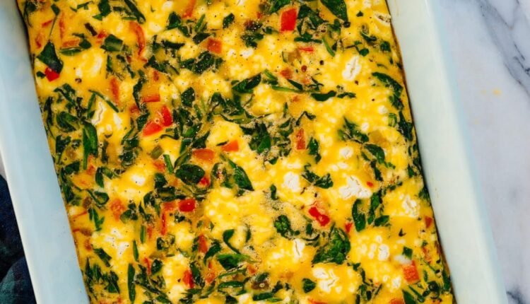 Make this healthy breakfast casserole recipe for the holidays or busy weekday mornings! Featuring red bell peppers, spinach and creamy cheese, this casserole is wholesome, hearty and full of fresh flavor. Recipe yields 8 generous servings.