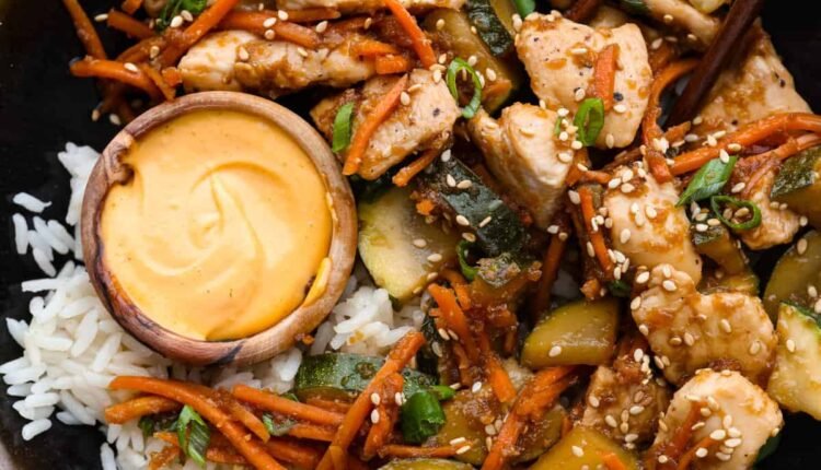 - Add Vegetables and Sauce: To the pan add the carrots, zucchini, and ½ cup hibachi sauce. Saute until the chicken is cooked through and the sauce has reduced. You can also add more sauce as needed.