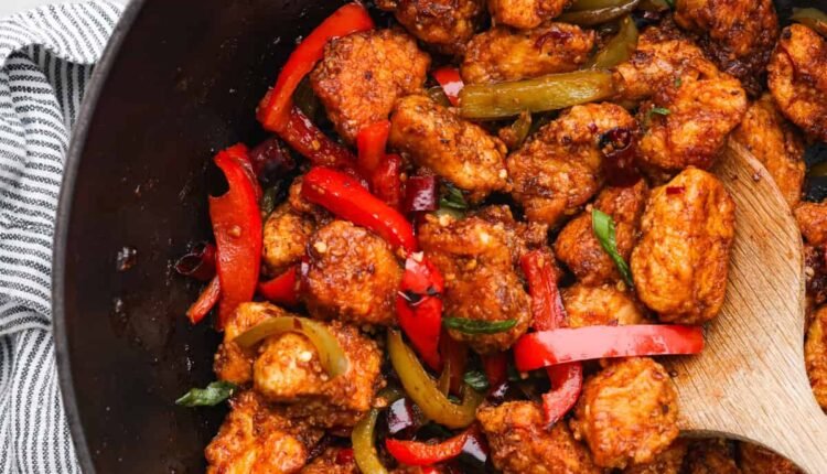 - Sauté Vegetables: Once all the chicken is cooked remove it from the pan and set aside. Add more of the oil to the pan and add in the red bell pepper, green bell pepper, and dried red chilis. Saute the vegetables until they begin to soften and brown.