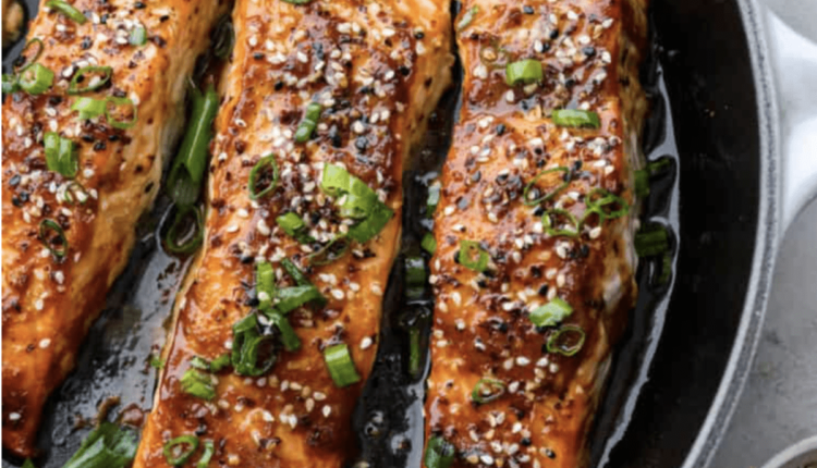 - Cook Salmon: Preheat oven to 375 degrees. In a large skillet or oven safe frying pan add the salmon and discard marinade. Bake for 12-15 minutes, or until fish is almost done and opaque. Brush with reserved glaze and Broil on high for 1-2 minutes until fish reaches 125-130 degrees in the center.