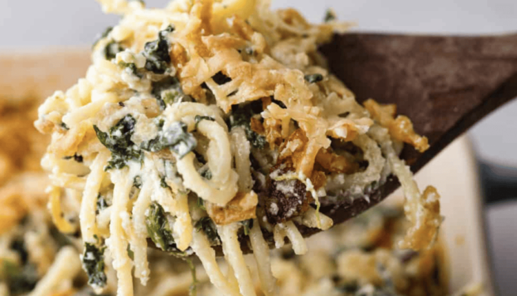 - Add the Spinach, Fried Onions, and Spaghetti to the Cheese Mixture: Add the spinach, 3 ounces of the crispy fried onions, and cooked spaghetti to the cheese mixture. Toss thoroughly to combine the ingredients altogether.