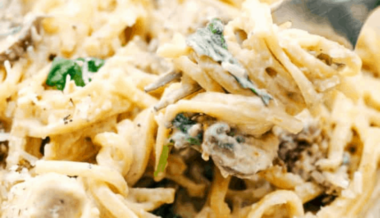 This meal is so flavorful and filled with so many delicious things. It’s seriously one of my all-time favorite recipes! Sun-dried tomatoes, mushrooms, chicken, and spinach all cook in the creamy sauce and get tossed in the pasta. You really can’t go wrong with this combination of ingredients.