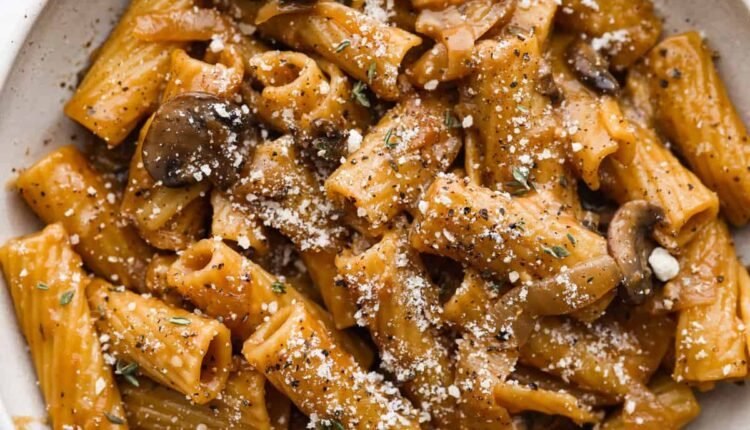 If you’re a fan of French onion soup, just wait till you taste this ultra-delicious French onion pasta recipe featuring rigatoni cooked in one pot with caramelized onions, mushrooms and thyme in a flavorful, creamy sauce. Garnish the dish with fresh thyme and grated parmesan cheese for an extra special finishing touch.