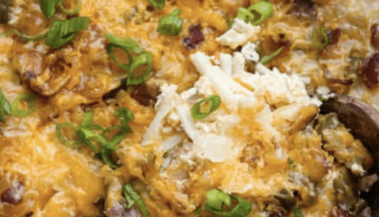 - Layer: Place ⅓ of hashbrowns on the bottom of the baking dish. Add ⅓ bacon, ⅓ onion, green pepper, and ⅓ cheese. Continue layering and end with cheese.