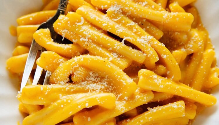 To make up for the roasted flavor, this recipe benefits from deeply toasting spices in butter—pumpkin spice blend, garlic powder and onion powder. Then, we cook a can of pumpkin purée in the flavored butter for a minute before adding pasta and water. Later on, we’ll stir in some cream cheese, sharp cheddar cheese and Parmesan. The end result is magical.