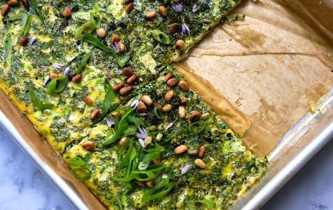 If you have a rimmed baking sheet, preferably the quarter pan size (13 x 9 x 1 inches), some parchment paper and a carton of eggs, you’re in business. To make a sheet pan frittata, line the pan with parchment paper, whisk a bunch of eggs together with a bit of cream, and add in whatever seasonal ingredients you like. If you love cheese and eggs, add some crumbled feta or goat cheese as well. Or grate some gruyere on top once the egg mixture is in the pan.