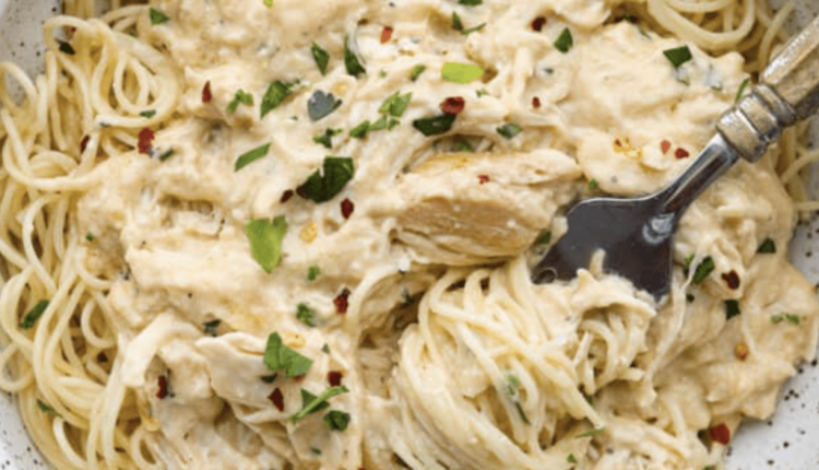 - Shred Chicken and Serve: Shred the chicken and serve over angel hair pasta. I like to garnish with fresh parsley and red pepper flakes!