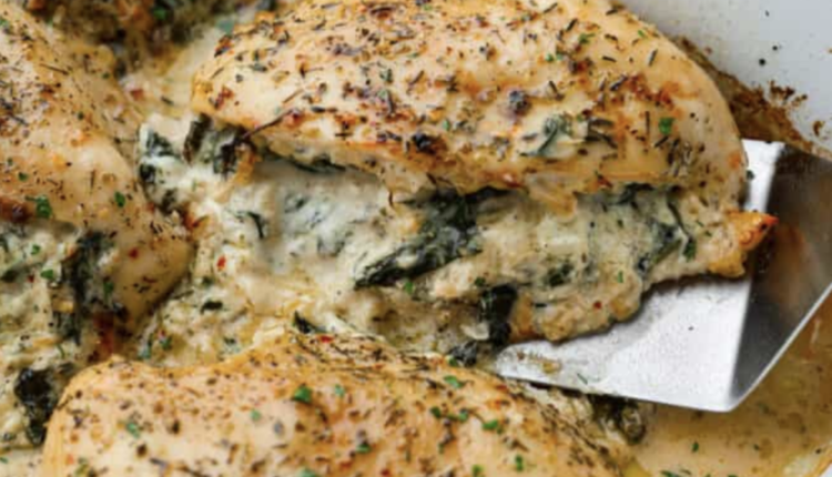 Rub the remaining 2 tablespoons of oil onto each chicken breast and season each one with the remaining spice mix. Stuff each chicken evenly with the spinach and cream cheese mixture until it has all been used.