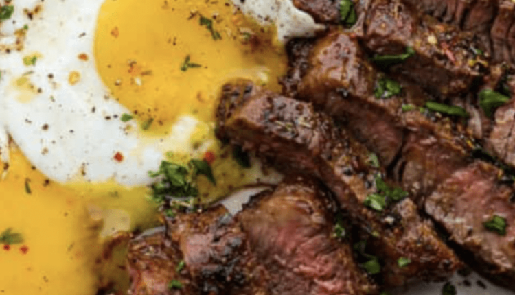 Steak and eggs is a hearty and delicious breakfast packed with protein and flavor! Tender and juicy pan-seared steak is seasoned to perfection and served alongside eggs sunny side up.