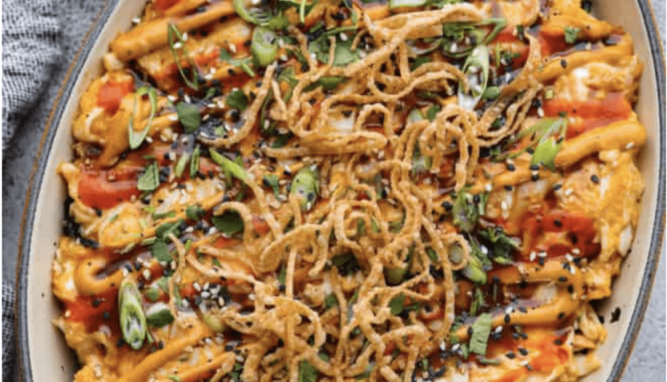 - Garnish and Enjoy: Drizzle the top with sriracha, spicy Mayo, and eel sauce. Garnish with sesame seeds, green onions, and cilantro. Serve with additional nori to wrap around bites of the bake.