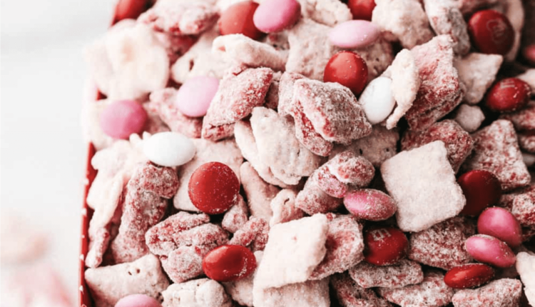 Sweetheart Valentine’s Buddies are a delicious and addicting mix of Chex covered in white chocolate and strawberry-flavored cake mix. Mix in some chocolate candies and it’s the perfect red and pink treat for Valentine’s Day!
