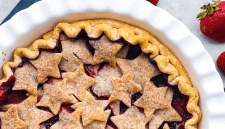 A patriotic fourth-of-July triple berry pie made simple with easy ingredients! This berry pie is bursting with juicy flavor and almost looks too good to eat. It’s the perfect centerpiece for any summer celebration!