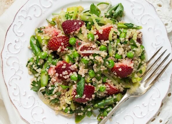 I’m celebrating spring with this warm spring salad featuring asparagus, leek, peas, strawberries, and parsley all tossed in a simple lemon olive oil dressing. It’s very light and veggie-packed with some protein provided by quinoa. If you’d like to add even more protein I’m sure it would be nice with some white beans, chickpeas, or French lentils thrown in too.
