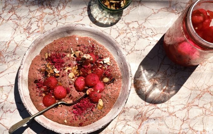 I spent a good chunk of time this week cooking beautiful Indian food from the recipes in Dishoom. With the air-quality in Los Angeles getting increasingly bad, staying inside to cook through a number of intensive recipes helped me take my mind off the increasingly heart-breaking situation here in California and West Coast. In addition to the bhel puri, multiple chutneys, mattar paneer, black daal, aloo sabzi, and a technicolor-flavored garam masala, I put a wonderfully sweet watermelon to use. It was a gift from a neighbor we’re lucky to have. I used little chunks of it in place of pomegranate seeds in the bhel puri, and then whipped up this chia-centric Watermelon Raspberry Breakfast Bowl in the blender.
